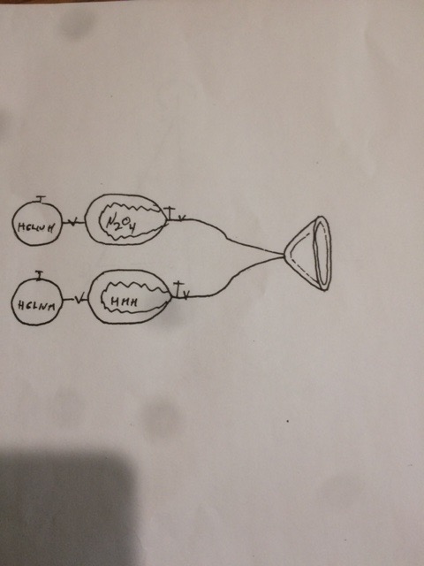 On the bulkhead were a gimbal platform, 2 infrared horizon scanners, pitch, roll and yaw freon gas valves and thrusters, an Inertial Reference Unit (IRU), and rate gyros, in addition to TWO orbit adjust engines. I also believe that the freon cold gas and orbit adjust hydrazine and Nitrogen Tetroxide storage tanks were on the back side of the bulkhead, with plumbing hardware to feed the freon valves or orbit adjust engines fuel when necessary. Likely near the OA fuel and oxidizer tanks behind the bulkhead were two helium tanks, which sent helium into the fuel and oxidizer tanks, to push a bladder to keep pressure on the fuel and oxidizer as it was used during the mission. This was likely implemented to have a good mix of fuel and oxidizer in the OA thrust chamber, which would give rise to a proper mix of the N204 (Nitrogen Tetroxide) and MMH (MonoMethyl Hydrazine) at OA engine on time. In a near zero G environment, who knows where the fuel and oxidizer would be in their tanks as the mission progressed; vehicle rolling, valves firing, payload mirrors being moved, and other perturbations could have caused the MMH and N2O4 to move anywhere, and not be near the OA engine port for use (i. e., mixing in the thrust chamber) when needed. See the sketch below which I found in my archives that shows the hookup. Note valves on output side of the N2O4 and MMH tanks which would be commanded open to start the Orbit Adjust activity. The 209 bulkhead was between the output side of the MMH and N2O4 tanks and the thrust nozzle where the fuels were mixed and combustion occurred when exeeuting an orbit adjust.
